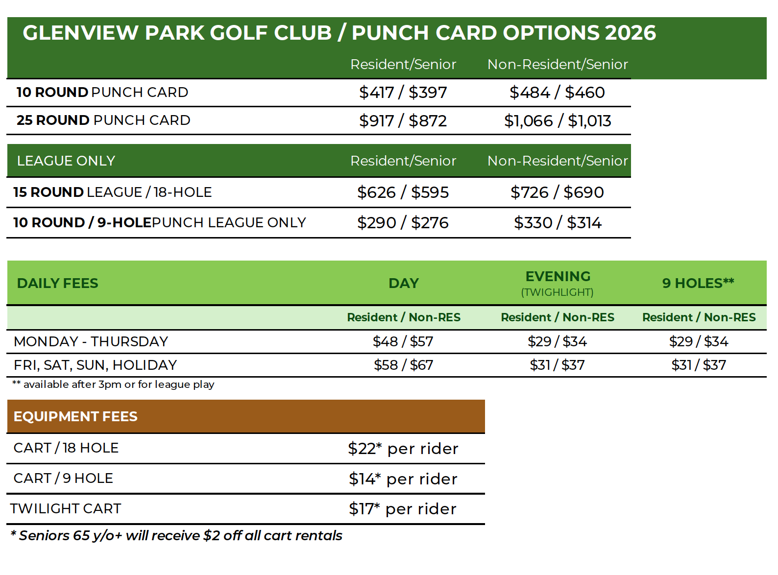 Glenview Park Golf Club reserves the right to schedule outside events. These events are noted on each individual League Agreement. On these dates, leagues will be required to be off course/equipment returned at a designated time prior to the event. League play may be adjusted to an earlier start time, Shotgun format or limited to 9-hole play where applicable.